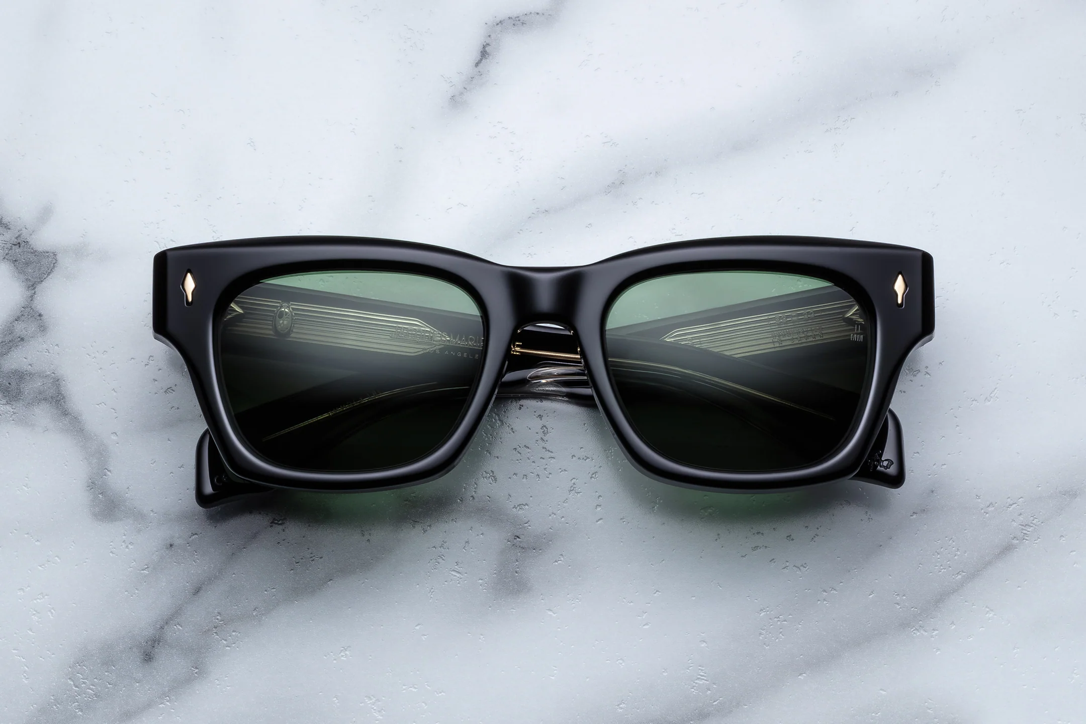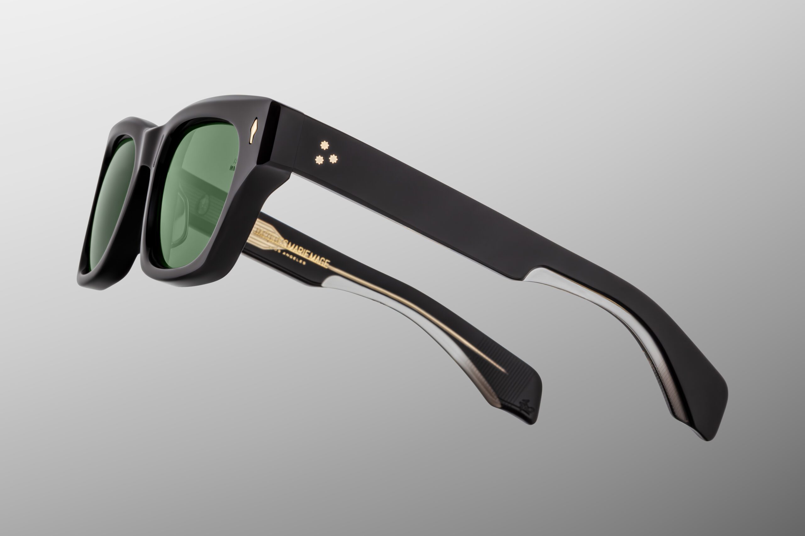 BLACK 10MM CURED CELLULOSE ACETATE FRAME CUSTOM DOUBLE LAMINATED ACETATE TEMPLES FEATURING PRECIOUS METAL HARDWARE AND GREEN LENSES