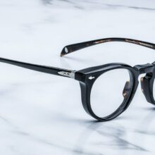 MATERIAL: 10MM BLACK W/ CLEAR CURED CELLULOSE ACETATE FRAME, CUSTOM DOUBLE LAMINATED ACETATE TEMPLES
